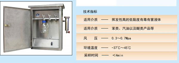 采樣控制器是一種密閉循環(huán)采樣的釆樣控制器,該采樣器采用壓縮風做動力,安全防爆,全自動操作, 下拉托盤式結(jié)構(gòu)。該釆樣器的智能型配備密閉取樣接口,對于有毒有害、易揮發(fā)的液體以及特殊要求的采 樣,可以與液體密閉采樣瓶配合,從而達到密閉采樣的效果。密閉儲罐采樣器分為兩種形式,一種為玻璃 瓶式密閉釆樣器,另一種為鋼瓶密閉釆樣器,玻璃瓶密閉儲雄采樣器結(jié)構(gòu)簡單' 成本低' 安全可靠。鋼瓶 密閉采樣器能夠自循環(huán),不需要每次清洗釆樣瓶。