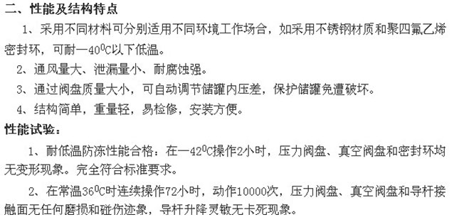 用途: 全天候呼吸閥是機(jī)械呼吸閥的換代產(chǎn)品。用于安裝原油、汽油、煤油、輕柴油、芳烴等固定頂式儲罐上的主要安全設(shè)備,是起蒸發(fā)損耗與保護(hù)儲罐在受超壓或真空時(shí)免遭破壞的作用。此閥通常與阻火器配套使用。