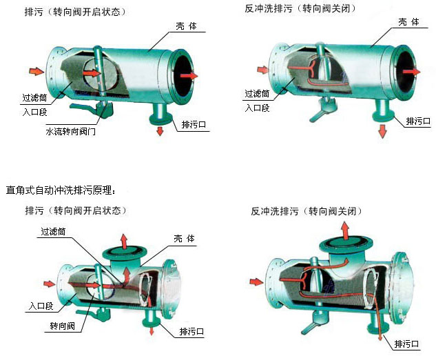 反沖洗時(shí),水流轉(zhuǎn)向閥為關(guān)閉狀態(tài),排污閥開啟,這時(shí)水流被迫從過濾網(wǎng)筒的入口段網(wǎng)孔進(jìn)入過濾筒外側(cè)與殼體夾層,反向從網(wǎng)筒外側(cè)沖洗粘附在網(wǎng)孔上的雜質(zhì),達(dá)到清潔過濾網(wǎng)的目的。由于轉(zhuǎn)向閥關(guān)閉,水經(jīng)過反沖閥后流帶增大,反洗效果好。