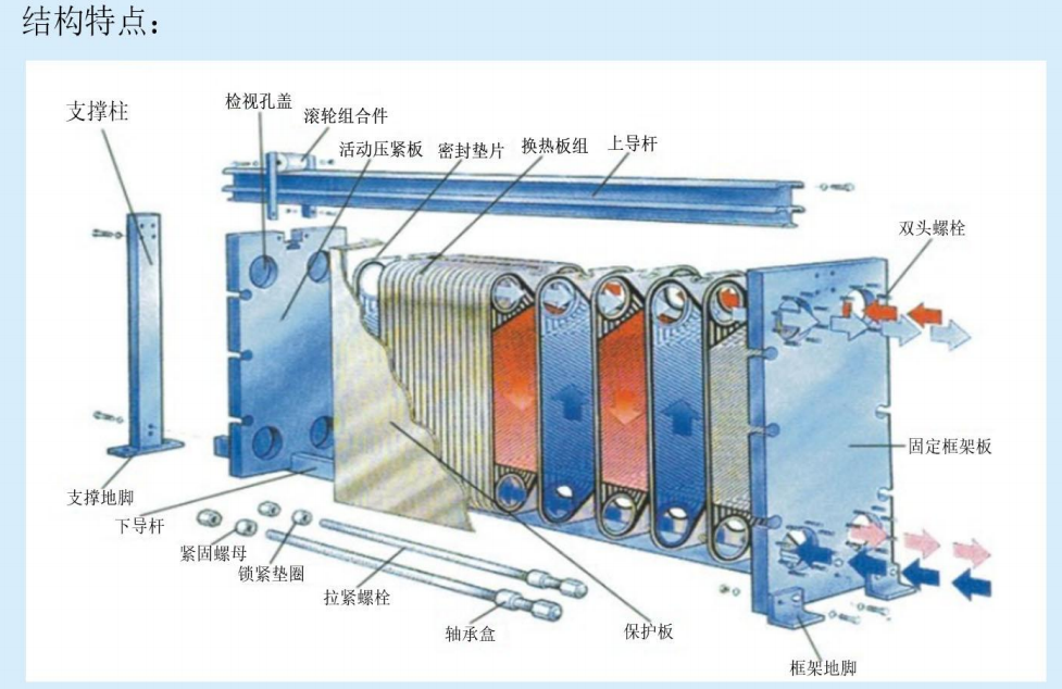 板式換熱器是由框架、傳熱板片組及夾緊螺栓等主要部件組成。