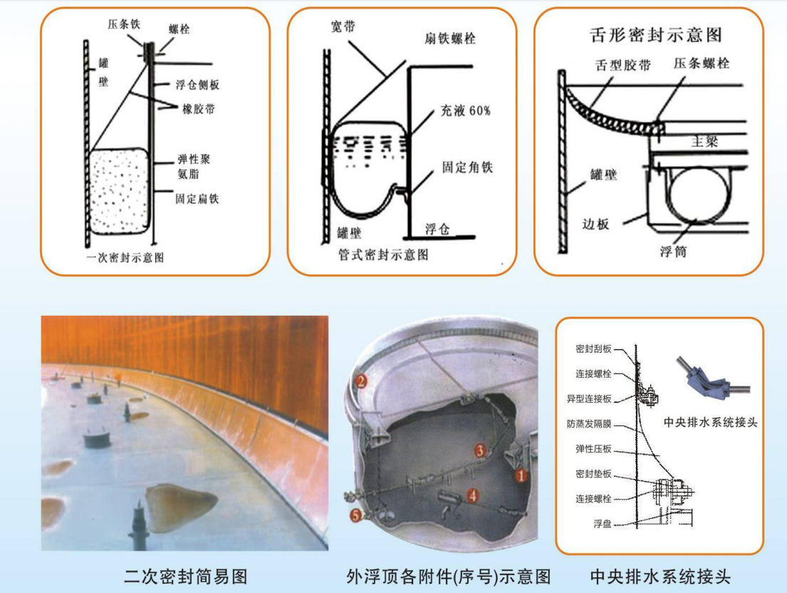 1、一次密封:應(yīng)用于外浮頂周邊與儲(chǔ)罐之間,由囊式膠帶、聚氨脂材料及襯板等組成,起密封作用的重要裝置。